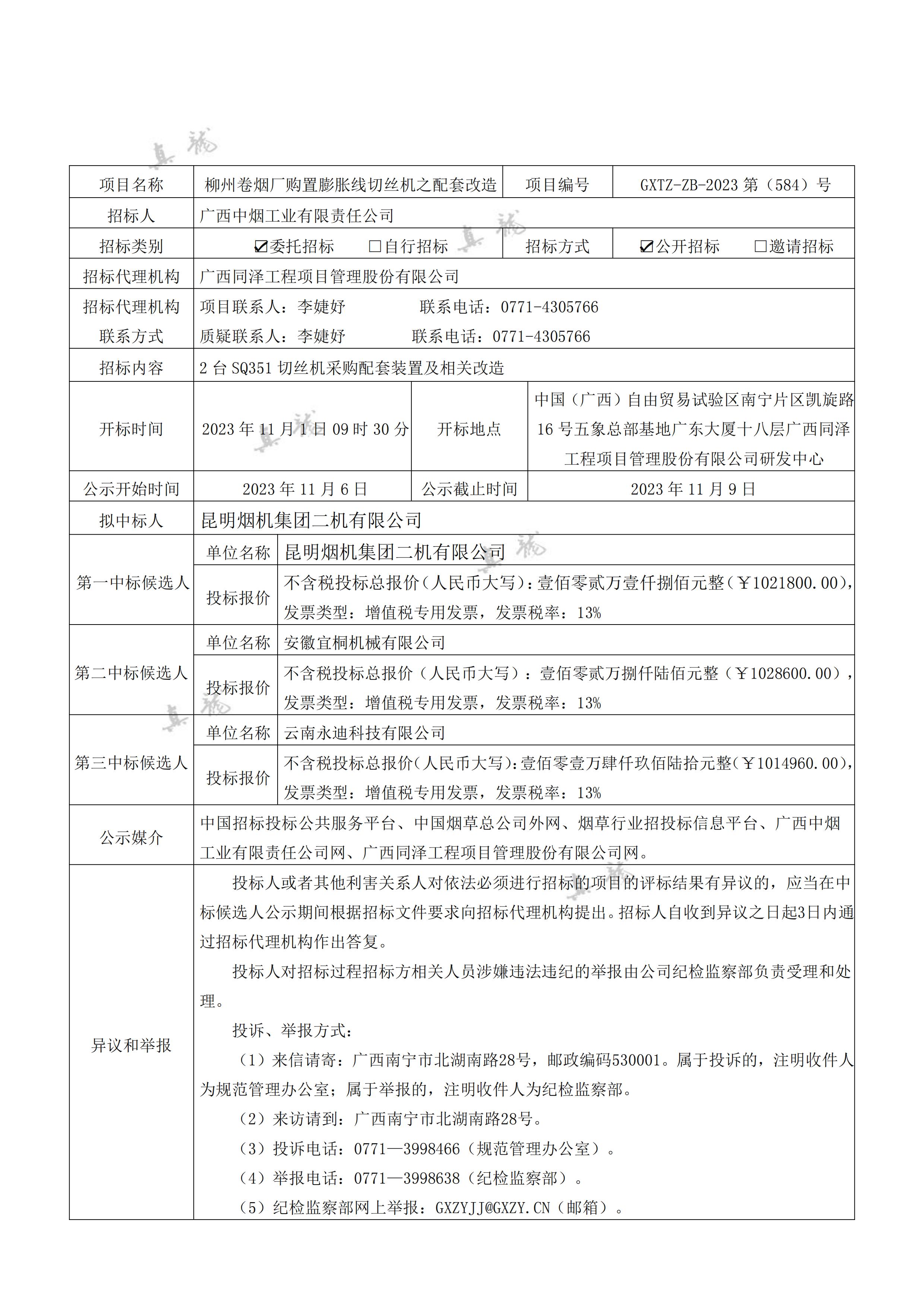 廣西中煙工業(yè)有限責(zé)任公司柳州卷煙廠購置膨脹線切絲機之配套改造(項目編號:GXTZ-ZB-2023第(584)號)中標(biāo)候選人公示