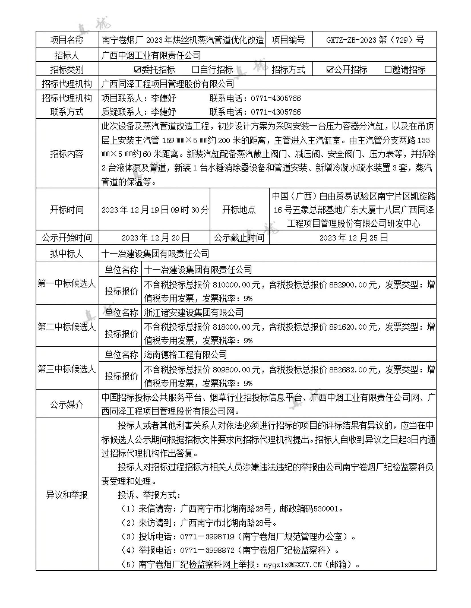 廣西中煙工業(yè)有限責(zé)任公司南寧卷煙廠(chǎng)2023年烘絲機(jī)蒸汽管道優(yōu)化改造(項(xiàng)目編號(hào):GXTZ-ZB-2023第(729)號(hào))中標(biāo)候選人公示