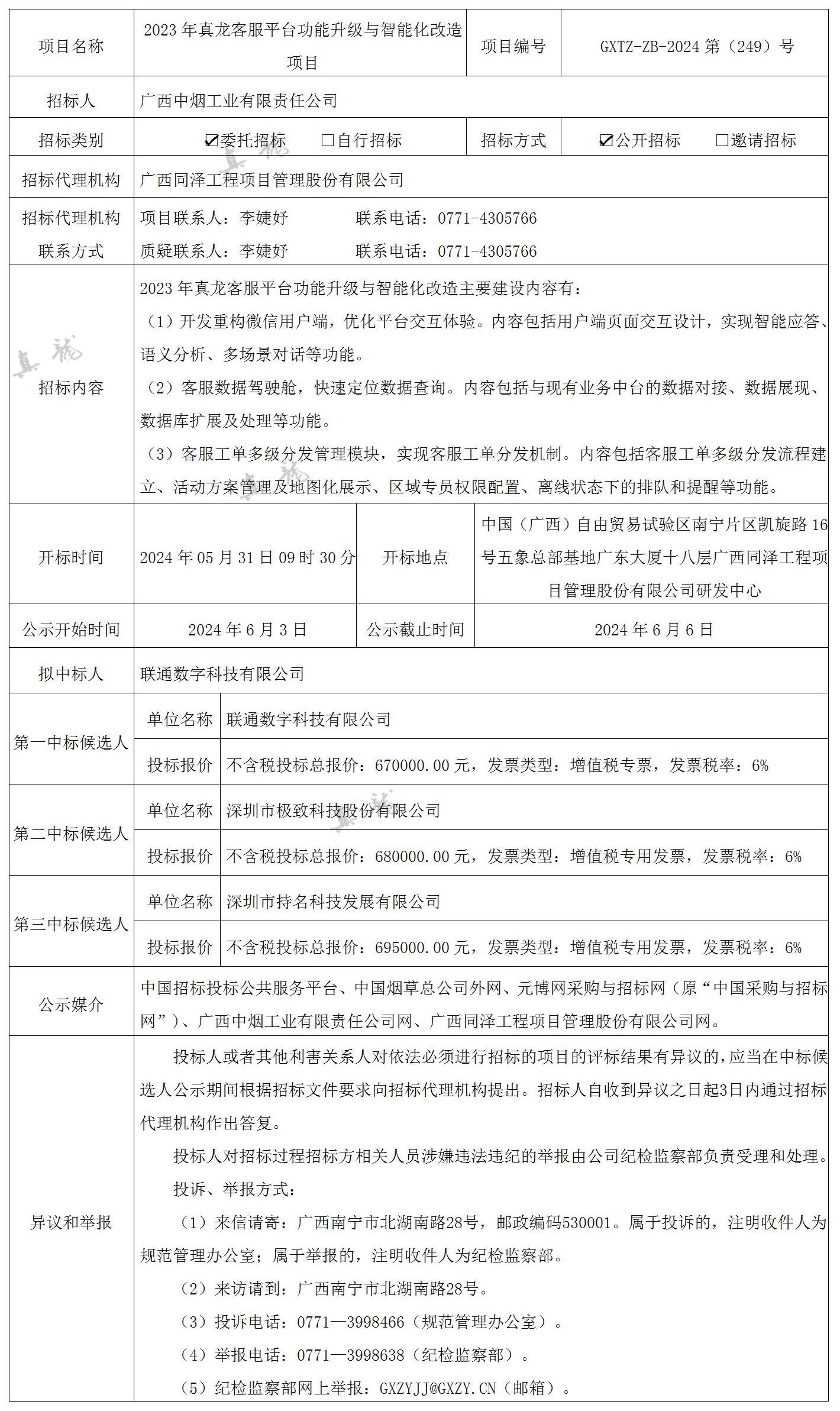 廣西中煙工業(yè)有限責任公司2023年真龍客服平臺功能升級與智能化改造項目(項目編號:GXTZ-ZB-2024第(249)號)中標候選人公示