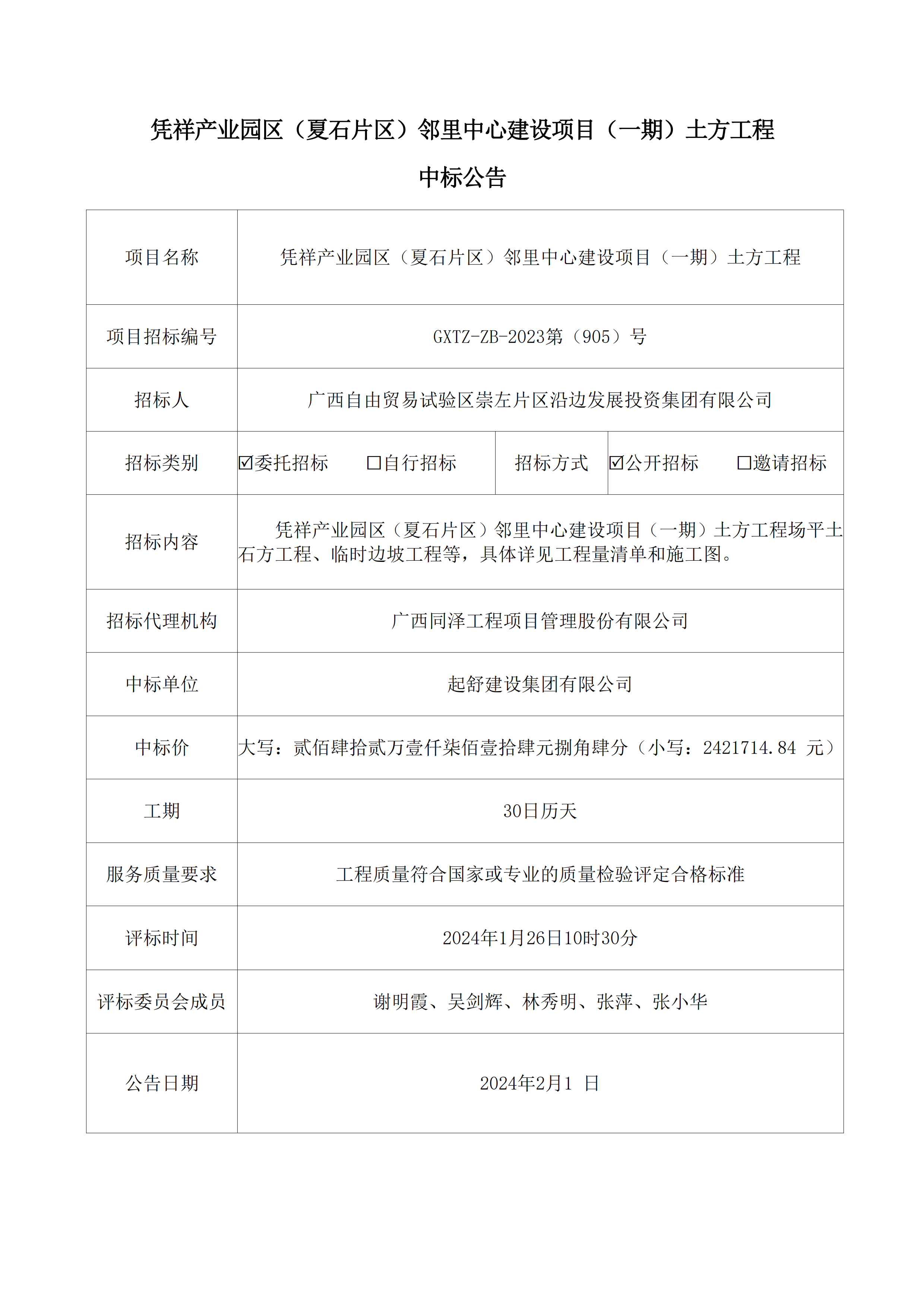 憑祥產(chǎn)業(yè)園區(qū)(夏石片區(qū))鄰里中心建設(shè)項目(一期)土方工程中標公告