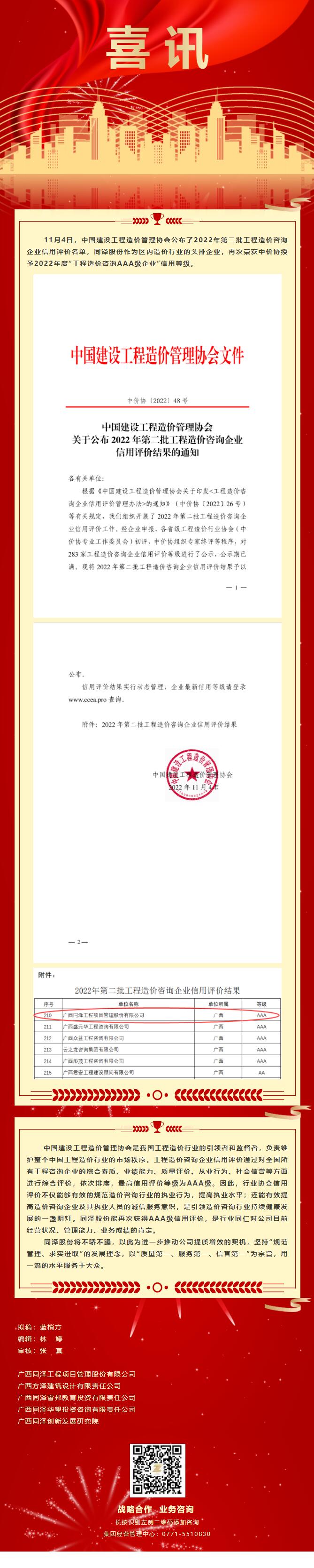 喜訊丨同澤股份榮獲中價(jià)協(xié)授予2022年度“工程造價(jià)咨詢(xún)AAA級(jí)企業(yè)”信用等級(jí)